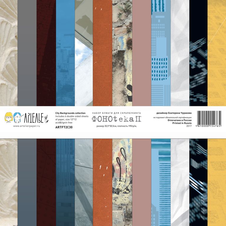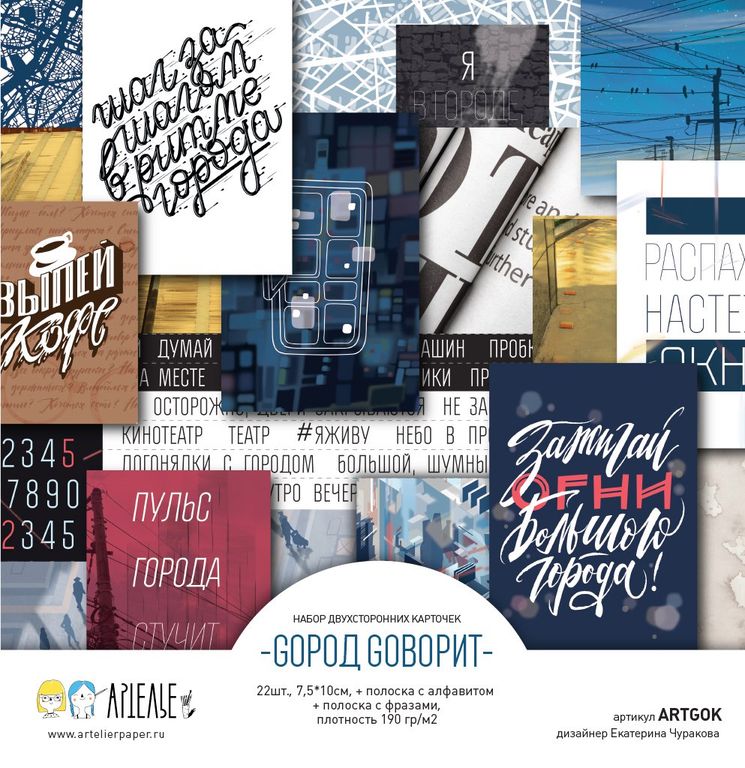 Набор "GOрод GOворит" включает в себя большой набор бумаги 30*30см, набор двухсторонних карточек (обратная сторона как 1/3 большого листа - может использоваться как фоновая подложка) и набор дополнительных фонов (6 двухсторонних листов 30*30см). Плотность бумаги 190гр/м3